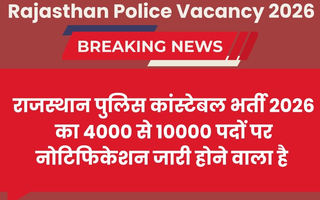 Rajasthan Police Vacancy 2026: राजस्थान पुलिस कांस्टेबल भर्ती 2026 के लिए 4,000 से 10,000 पदों पर भर्ती होगी। पुलिस मुख्यालय द्वारा कांस्टेबल भर्ती प्रक्रिया शुरू हो चुकी है। इस महीने के अंत तक राजस्थान पुलिस कांस्टेबल भर्ती के लिए आधिकारिक सूचना जारी हो सकती है गृह मंत्रालय ने 4,000 से 10,000 कांस्टेबल पदों पर भर्ती के लिए वित्तीय और प्रशासनिक स्वीकृति प्रदान किया है ।